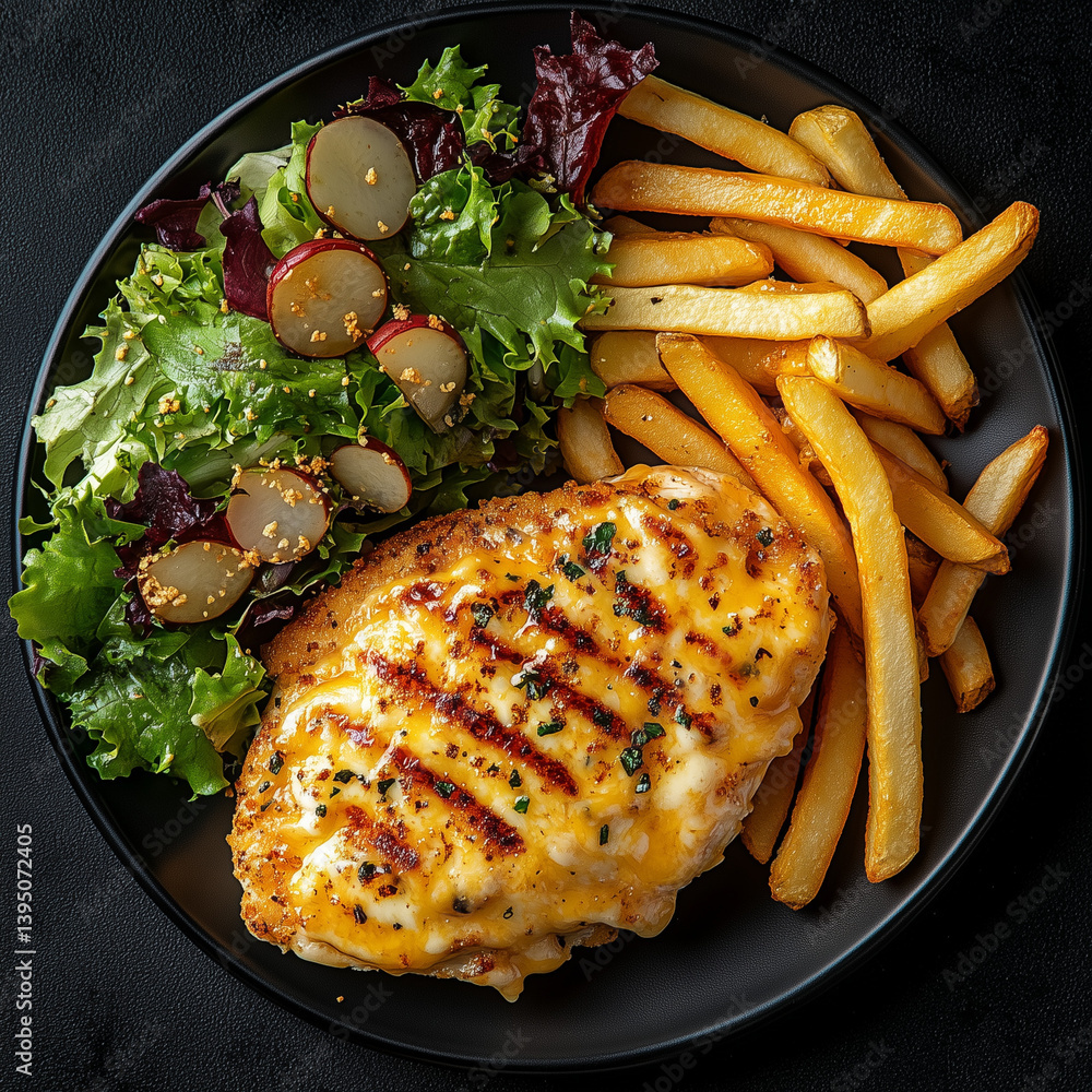 Kanabroileri, ranskalaiset, perinteinen salaatti, currykastike, talon kastike