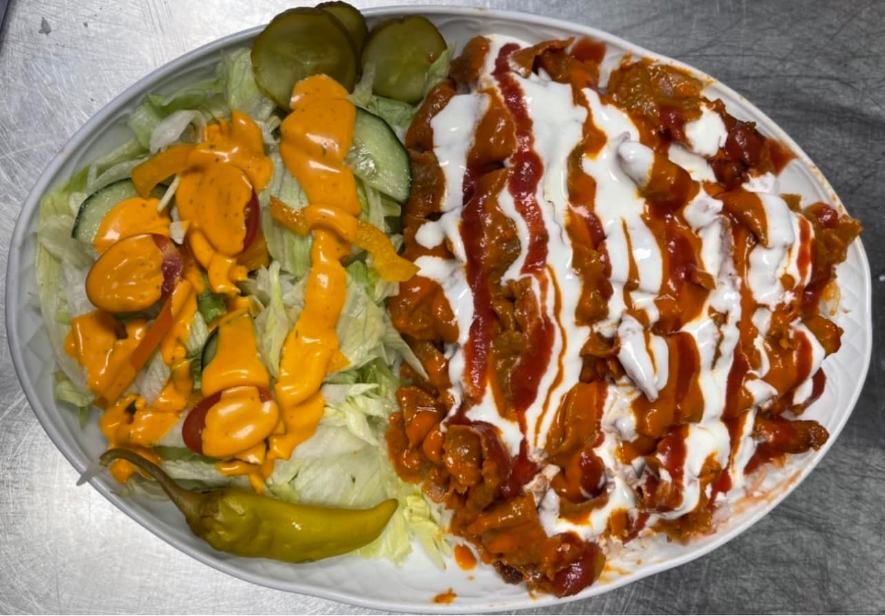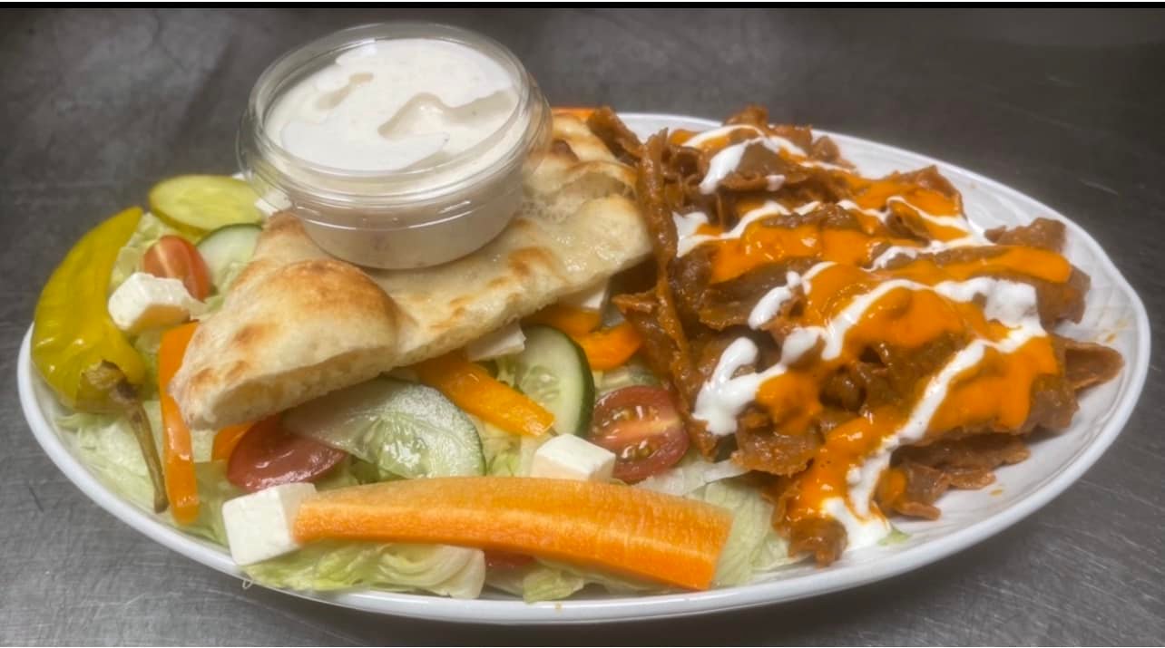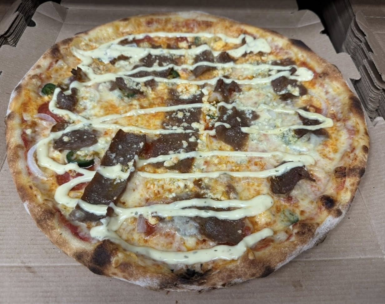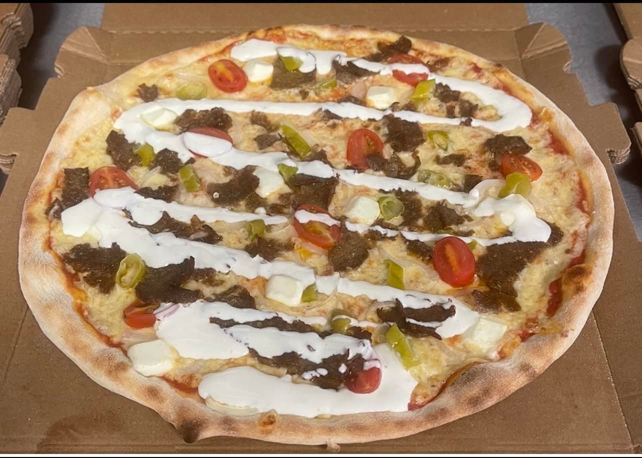 Tuore pizzapohja, kebabliha, salaatti, aurajuusto, tomaatti, kurkku, kastikkeet