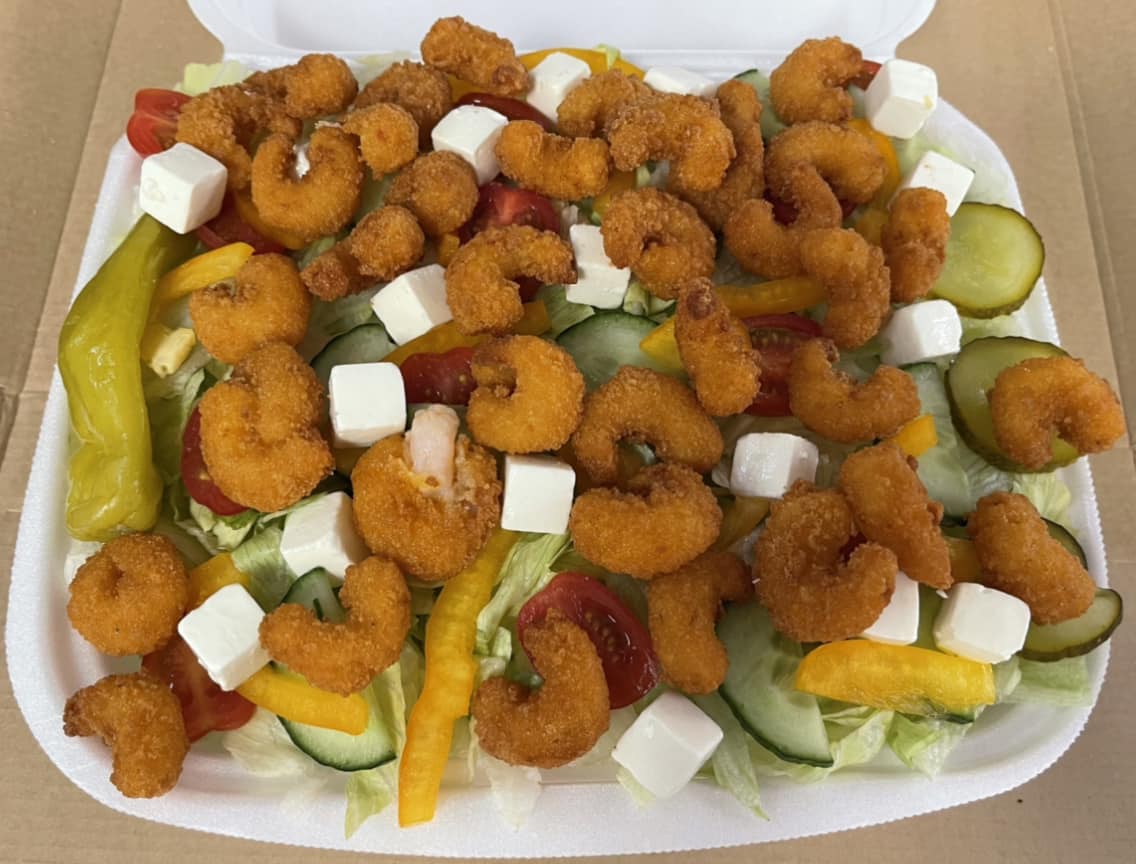 Jäävuorisalaatti, tomaatti, kurkku, salaattijuusto, sipuli, jalopeno, kastike